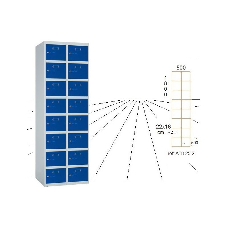 - Dimensiones estándar de serie de todas las taquillas= 1,80 m. de alto x 0,50 m. de fondo.